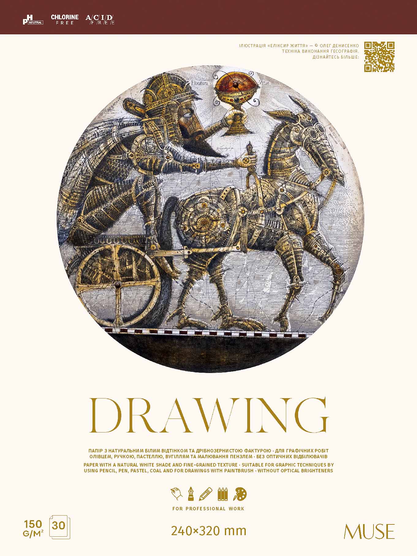 Sketch & Draw" és „Drawing” termékek kiválóan alkalmasak ceruzával, szénnel, vörös krétával, viaszkrétával történő rajzoláshoz. Természetes fehér árnyalatú, ellenálló papírok sima felülettel, optikai fehérítő nélkül. Az egyik újdonságunk borítóját Oleh Denysenko alkotásai díszítik, melyek az általa szabadalmaztatott egyedi és innovatív technikával, az ún. gassográfiával készültek.